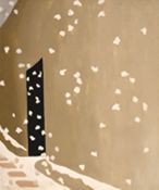 A brown adobe wall, seen from a sharp angle, stands on a patch of snow-covered earth. A black door gapes at the wall's midpoint. Large, soft snowflakes fall, covering the image with white dots. Square, reddish-brown tiles run along the ground.