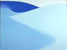 A large, pale blue hill fills the left side of the canvas. On the right side of the image, a slightly darker triangle of blue fills the foreground. Behind this, a distant, deep blue hill slopes downward beneath a white sky.