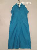 Dress, teal blue, sleeveless, slash pockets,fold-over collar, turquoise silk, (knock-off of the Claire McCardell dress (research tailor) 2000.3.430), GOK wore camping in Glen Canyon, but this is a silk evening dress version. Pinked seams, cut on bias; cotton twill tape on seams, V-neck. SW thinks polished cotton? U.S?