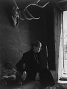 Striking profile portrait of O'Keeffe dressed in black, seated on the banco at the entrance of her Abiquiu house under a large set of elk antlers, exquisite tonal range, white shafts of ambient light falling on her forehead through the doorway.