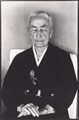 Frontal half length portrait of O'Keeffe sitting on a white cushion against an adobe wall (in the Abiquiu house?), her hair is pulled back from her face, she faces towards the camera with eyes closed, hands are folded in her lap; she wears one of her black wrap dresses, a white v-neck shirt or dress, her Alexander Calder pin, and her favorite Taxco black suede / sterling silver belt.
