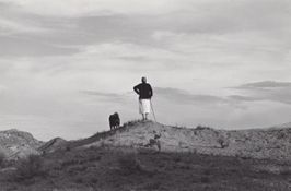 Georgia O'Keeffe standing centered on a small hill or mound in the desert landscape with her dog looking off into the sky and clouds with their backs to the viewer. One hand is on her hip and the other arm is leaning on a walking stick; she wears a black jacket and light colored skirt with her hair pulled back in a bun.
