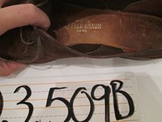 Dark brown suede lace-up shoes with hard insoles that read, "made by Fred Braun New York". Black leather laces, 4 lace eyeholes in each shoe. Hard black bottoms. "8B" handwritten inside back of each heel.