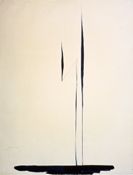 Two thin vertical lines extend from a horizontal line running along the bottom of the paper. One of the lines zigzags downward near the center of the composition, forming a sideways Z shape. The dark blue forms contrast with the plain white paper on which they appear.