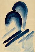 Two blue, semicircular forms arch one over the other. Strips of blue paint run diagonally over the lower right corner of the composition. The shapes sit against plain, exposed white paper.