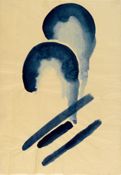 Two rounded forms, dark blue outside and fading to white at their centers, occupy the center of the composition. In the lower righthand corner, three blue brushstrokes move diagonally across the page.