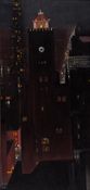 Whitney Archive indicates, "Exam. at Amer. Place, March 1946. . . . No signature." Whitney Archive, Downtown Gallery Archive, Abiquiú Notebooks date 1928. Dated 1928/1929 on basis of verso inscription and inclusion in 1930 exhibition. Pictured in 1930 and 1935 New York (An American Place) Stieglitz installation photographs, see Appendix III, figures 38, 40, 58. This painting depicts the Beverly Hotel that O'Keeffe could see from the north window of her 30th floor apartment at the Shelton Hotel. Reproduced and titled New York – Night in Creative Art (June 1931). (Source: Lynes, 1999)