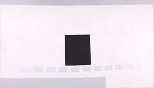 Large canvas of mostly white with an abstracted reference to the black door from the adobe wall of her Abiquiú home. The door is represented by a large black rectangle in the center, with line of grey-blue squares suggesting the stepping stones along the path. Along the top and bottom edges of the canvas are lines of a darker blue grey, thin on top, thicker along the bottom.