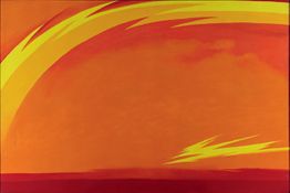 A bright yellow, lightning bolt-like shape arches over an expanse of orange paint. Along the canvas' bottom edge is a strip of vibrant red paint. Another smaller lightning bolt of yellow zigzags near the bottom right corner of the work.